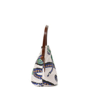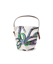 中綿生地にスカーフ柄をプリントしたバケツショルダーバッグ。底が丸型でマチが広く、丈夫な生地で荷物もたっぷり入るサイズ感です。口元にマグホックが付いているので、中の荷物も安心です。通勤や通学、旅行やマザーズバッグとしてあらゆる用途でお使いいただけます。