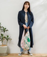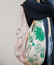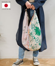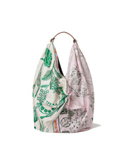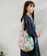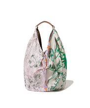 2枚のシルクスカーフを繋ぎ合わせたようなバッグ。手持ちでも肩掛けでも◎。大人の遊び心を誘うデザインとシルクならではの上品な光沢感が美しく、スタイリングのアクセントになります。