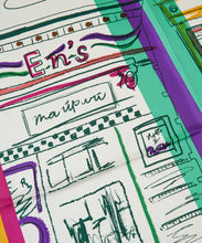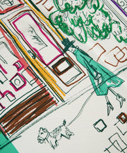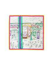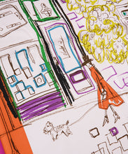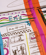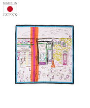いつかの見た風景をミックスしたスケッチタッチなスカーフ。なんとなく見かけた風景は鮮明では無いが、今も色鮮やかに思い出として頭の中に存在しています。その明確ではない情景を起こし、鮮やかなラインを入れることで思い出とはいつも鮮やか、という事を表したデザイン。右上に描かれた言葉は、”年に一度は行ったことのない所へ行こう。”