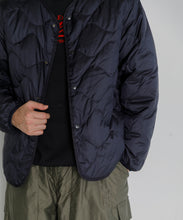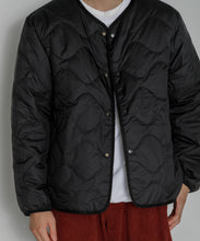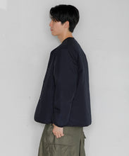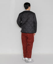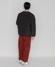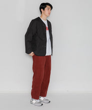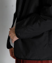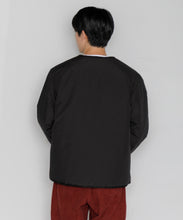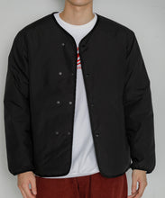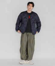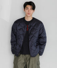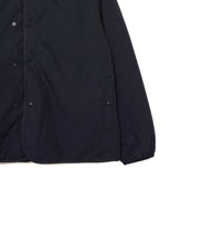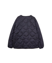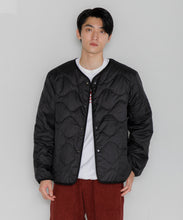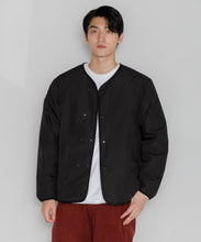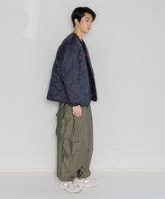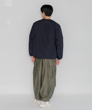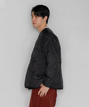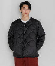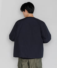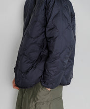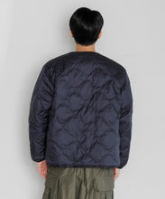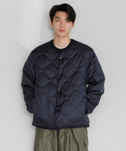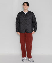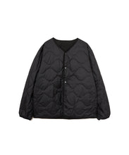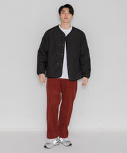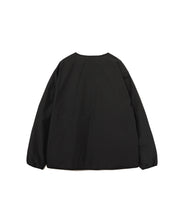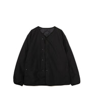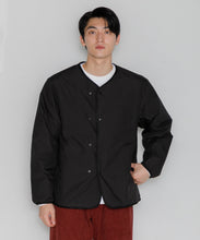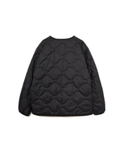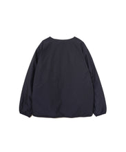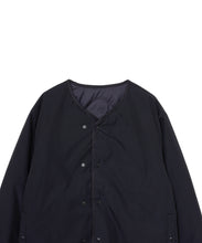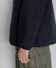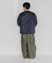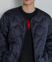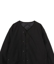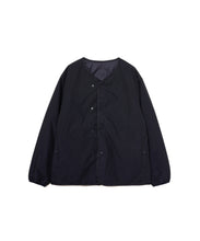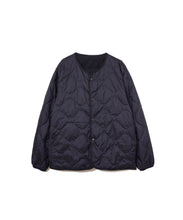 ミリタリーライナーをデザインベースにしたリバーシブル仕様のダウンカーディガン。フロントのアジャストボタンでフォルムを絞ることも可能です。表側はフラット、裏側にはキルトステッチが配されています。デイリーに使いやすい一着です。表側はポリエステルとコットンをミックスした糸を高密度に織り上げた軽量のウェザークロス、裏側は強度の高いポリエステルリップストップ、中わたは体が発する遠赤外線を輻射して保温効果を高める高機能な光電子ダウン®を使用しています。