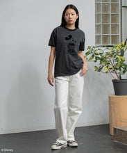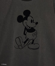 「ミッキーマウス」がかわいいTシャツ。首元と袖口のリブがアクセント。「ミッキーマウス」はフロッキープリントで描かれておりマットな質感と立体感が特徴です。カジュアルスタイルに合わせやすい一枚です。