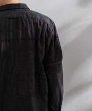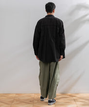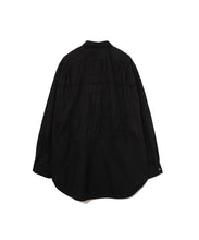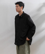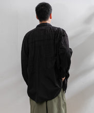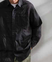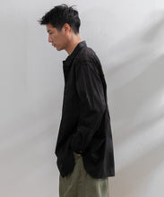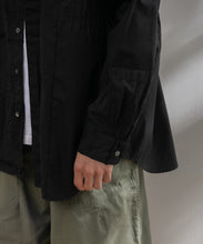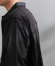 レースなどの異素材を組み合わせて作ったカラーシャツ。異素材MIXながらも、1トーンでまとめておりシックな印象。一見シンプルなシャツながら、近くで見るとものづくりへのこだわりが感じられる一枚です。比翼仕立てでスマートな雰囲気。一枚で着るのはもちろん、長めの着丈なのでアウター感覚で羽織ってもまとまる、万能なアイテムです。