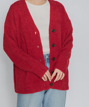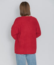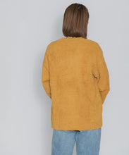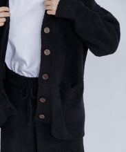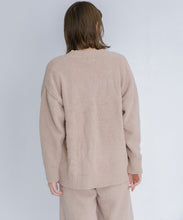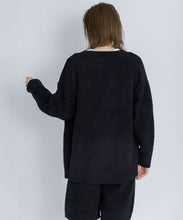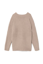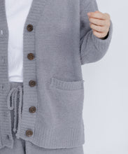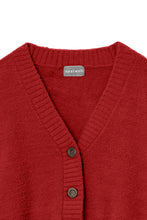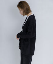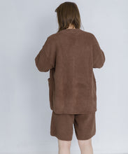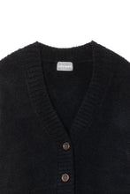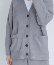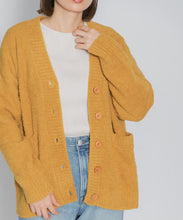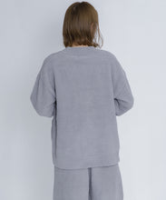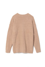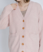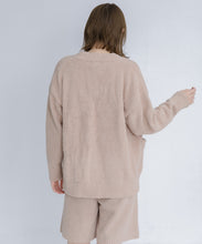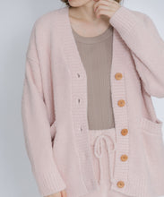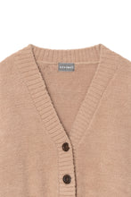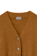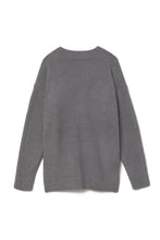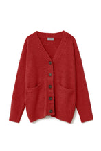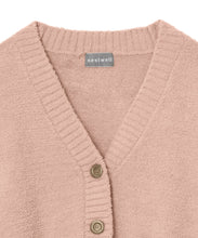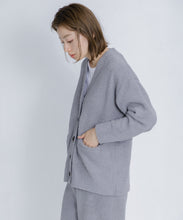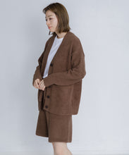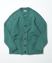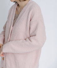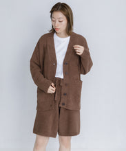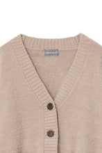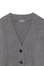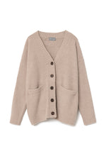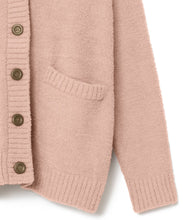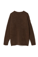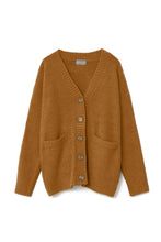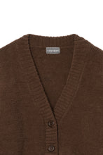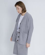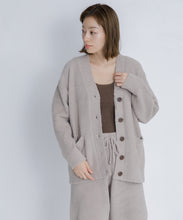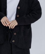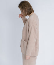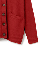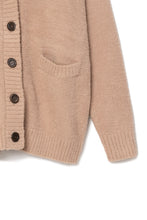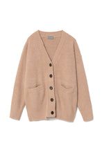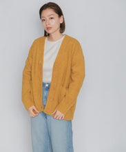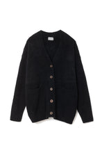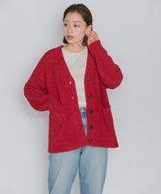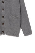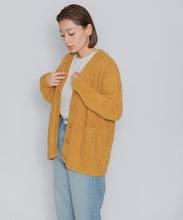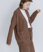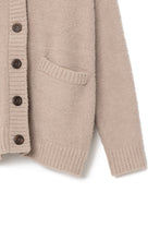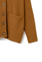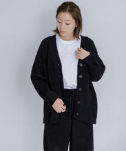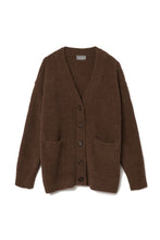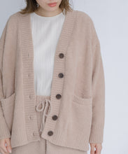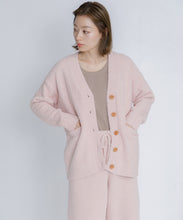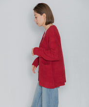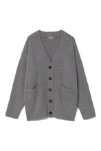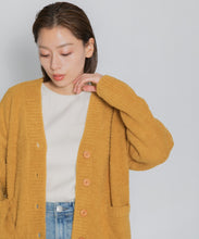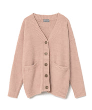 オリジナルロゴ入りのウッドボタンがアクセントのオーバーサイズのVカーディガン。ウエストのポケットは、外出時にスマホなどの小物を入れたり、手を温めるのに便利です。