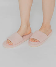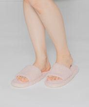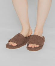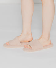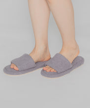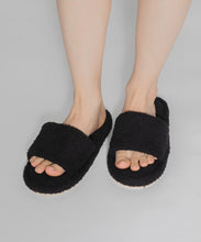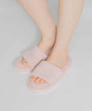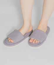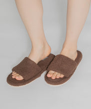 つま先のあいたモコモコした素材に、すっきりシルエットのスリッパ。