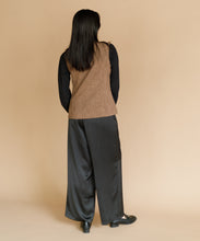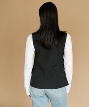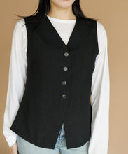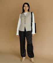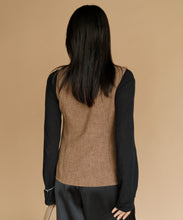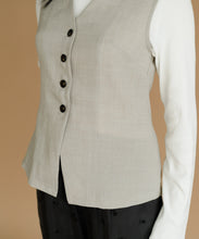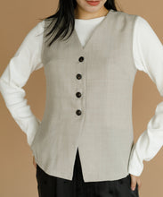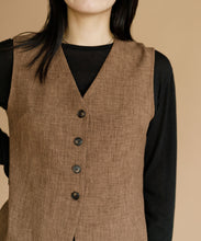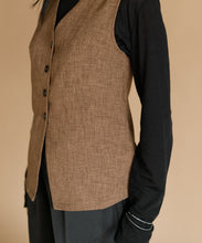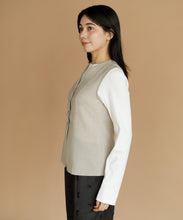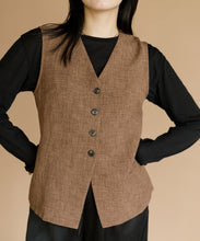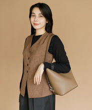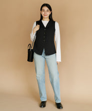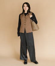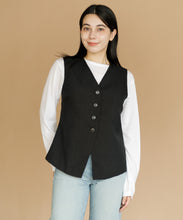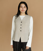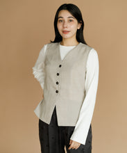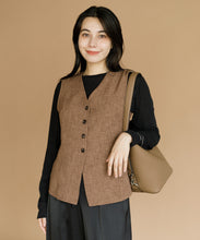 麻のような涼しげな素材のシングルベスト。シンプルなTシャツやカットソーにプラスするだけで、一気にトレンド感あふれるコーデが完成します。ウエストがさりげなく絞ってあり少し長めの丈感なので、着るとほっそり見えの効果も。スカートでもパンツでも合わせやすく、一枚あると重宝します。秋口まで使えるアイテムです。