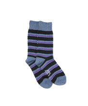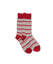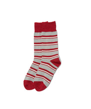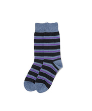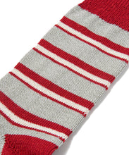 コーディネートのアクセントとなるボーダーソックス。少しルーズな作りで、しめつけ感が少ない履き心地が特徴的です。扱うのが難しいXマシンという貴重な機械を使用し、通常よりも太い糸束で編み上げており、履き心地と耐久性を両立しました。ギフトにもおすすめのアイテムです。