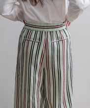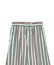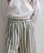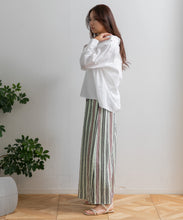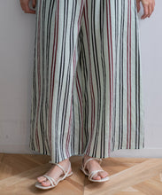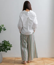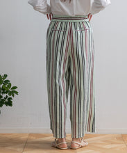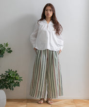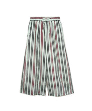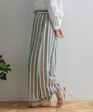 テンセルとポリエステルのしなやかなインポート生地を使用したフレアパンツ。エキゾチックなストライプ柄とテンセルのマットな光沢が美しく、繊細で気品のある雰囲気です。スカートにも見えるワイドシルエットがポイントです。ストレスフリーな着心地でおうち時間のリラックスウェアとしてもおすすめです。