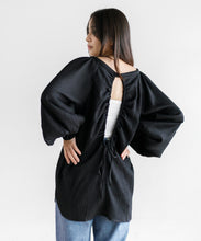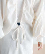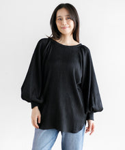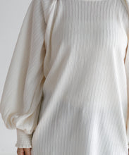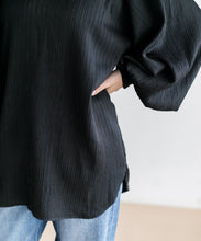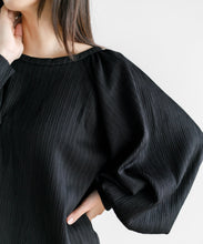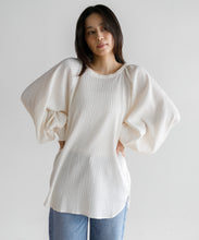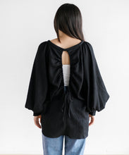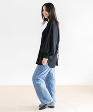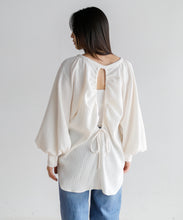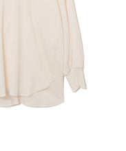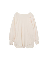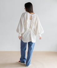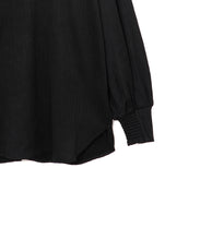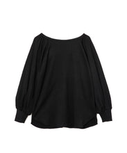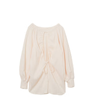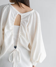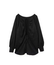 たっぷりギャザーのボリューミーなデザインブラウス。バックリボンの絞り具合で肌見せ感を調整できます。細かいタックを施したような、凹凸感のある特徴的な素材感です。パンツでもスカートでも合わせやすく、キレイめからカジュアルまで幅広く対応できる一枚です。