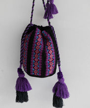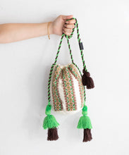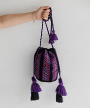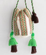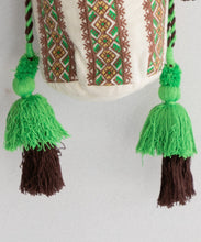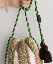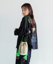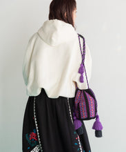 カラフルな幾何学刺繍が目を引くバッグ。刺繍と同じカラーの紐とタッセルがポイントで、丸底デザインにより収納力も抜群です。ちょっとしたお出かけにも便利なアイテムです。