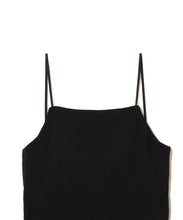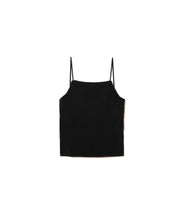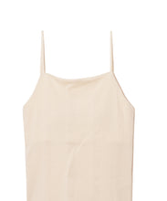 ネックをストレートなデザインにしたキャミソール。スッキリとした印象で、1枚でも重ね着でも重宝する1枚です。後の肩紐を脇寄りにつける事で、後あきデザインのTOPS と合わせても紐が見えにくくなっています。カップは取り外し可能です。