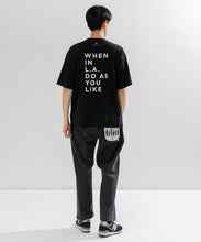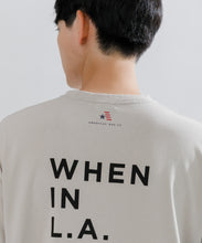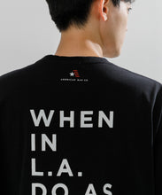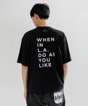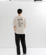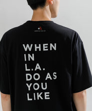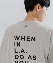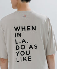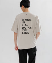 「When in Rome, do as the Romans do.(郷に入っては郷に従え)」ならぬ、「When in L.A., do as you like to do.」”L.A.に入ったらお好きにどうぞ"のプリントTシャツ。一枚でも、カーディガン等のインナーとしても、合わせやすい一枚です。レーヨン混の天竺素材を使用しており、ややオーバーサイズなので、着用するとこなれ感の出るシルエットです。ユニセックスでご着用いただけます。
