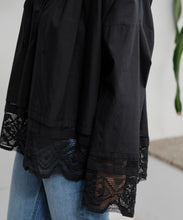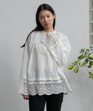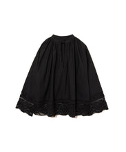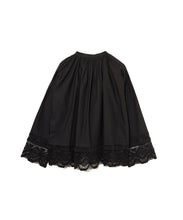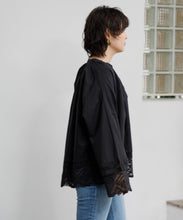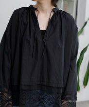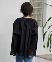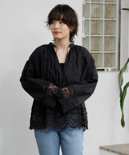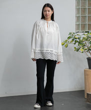 着心地の良い綿素材のブラウス。首元のシャーリングと、袖口・裾部分にたっぷりと使ったレースがかわいらしさを引き立てます。ゆったりとした身幅で、ふんわりとした優しい印象に。首元のリボンは、垂らしても結んでも使えて、気分によって変化をつけられます。デニムとの相性も良く、春コーデにぴったりの一枚です。