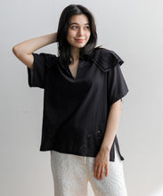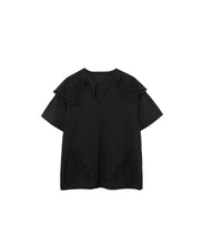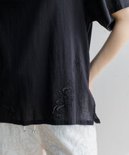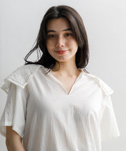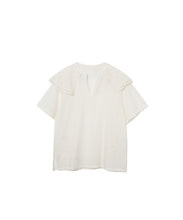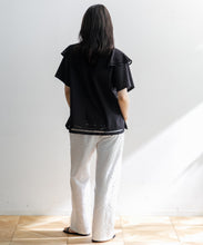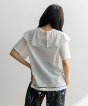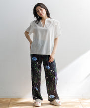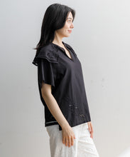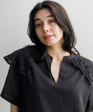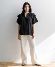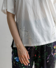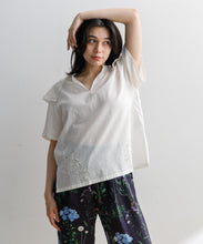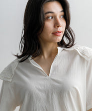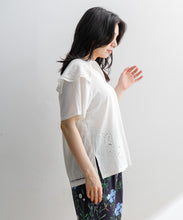 襟と裾部分の繊細なカットワークがかわいいコットンブラウス。身幅に余裕を持たせたシルエットにやわらかな綿素材で、蒸し暑い夏にも快適な着心地です。大きめの襟がスタイリングのデザインアクセントとなり、オンオフ問わず使えるアイテムです。オフホワイトはやや透け感があるので、タンクトップ等と合わせていただくのがおすすめです。