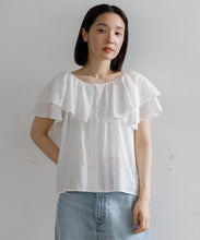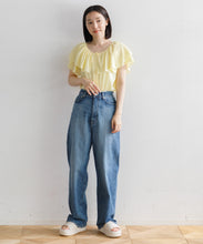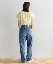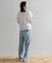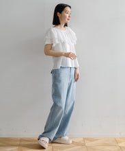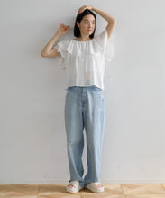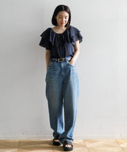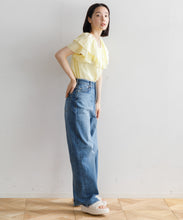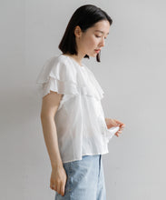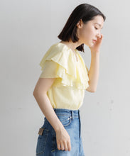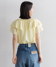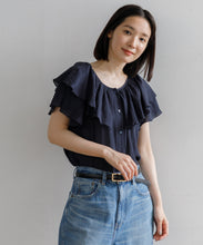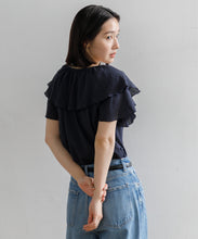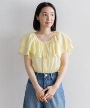襟から袖にかけてフリルになっているブラウスです。ふわっと軽い生地のフリルが、見た目を華やかにしてくれます。また、袖もフリルになっているので、二の腕をふんわりカバーしてくれる嬉しいアイテム。パンツと合わせて大人カジュアルに、ロングスカートやフレアスカートと合わせればフェミニンな印象にもなる着回し抜群のアイテムです。