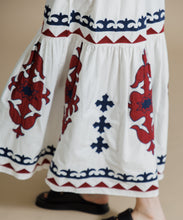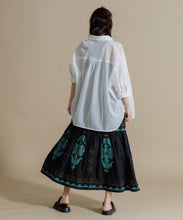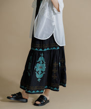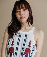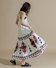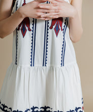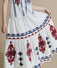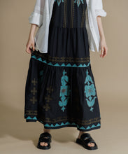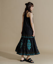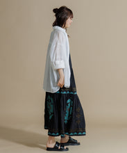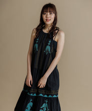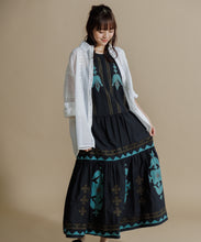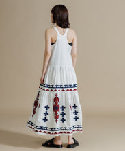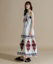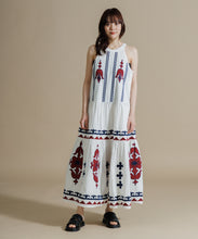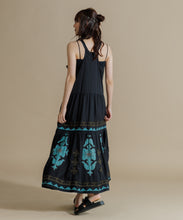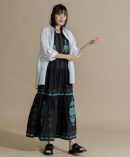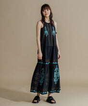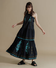 大胆な幾何柄のアップリケ刺繍が施されたホルダーネックのロングワンピースです。 スカート部分のティアード切り替えが程よいボリューム感を演出し、夏に大活躍。 カットソーやシャツとの相性が良く、ロングシーズン着回し可能な一枚です。左側のボタンもさりげないアクセント。両サイドにポケットがありちょっとしたお出かけにも便利です。さらっとした厚手の綿素材で肌触りが良く、透け感を気にせず1枚で着用いただけます。