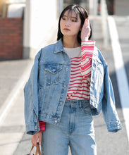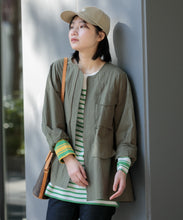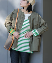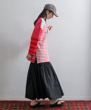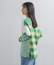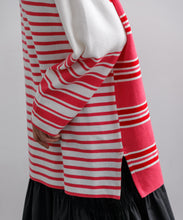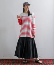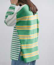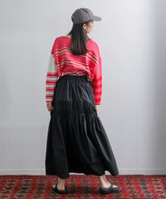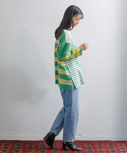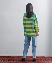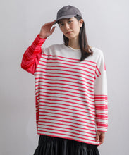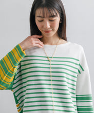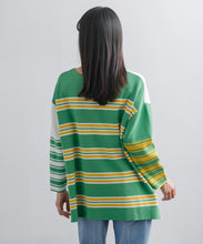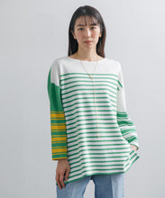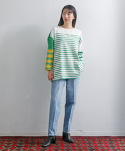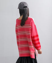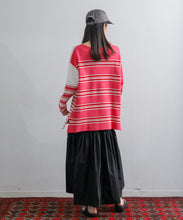 少しシャリ感のある素材で編んだニットプルオーバー。前後袖のボーダー柄や色のパターンが異なる遊び心のあるクレイジーパターンが特徴です。ワイドシルエットでリラックス感もありつつ、ややハリのある編み地できちんと感も兼ね備えた1枚。ピング系グリーン系の2色展開。春らしいカラーで気分のアガるアイテムです。