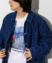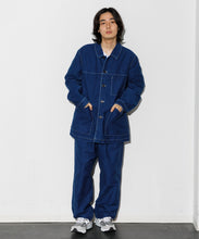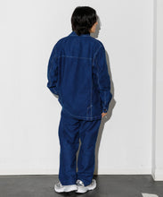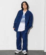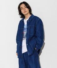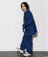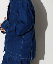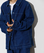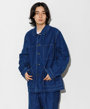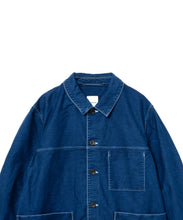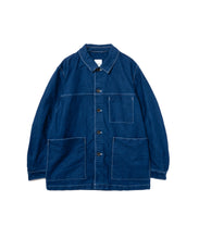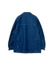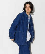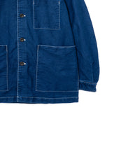 ステッチワークと左右の大きなポケットが印象的なカラージャケット。インディゴ染めで表情のある風合いです。ヒップまでかかる長め丈で、季節の変わり目に使いやすいアイテムです。