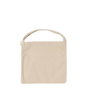 薄手の風合いのあるキャンバス生地に、メッセージ刺繍がキャッチーなショルダーバッグ。大きいサイズ感ですがショルダー部分が太幅なので、PCなど重いものを入れても肩の負担が少ないです。