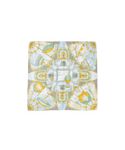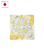 パリの著名なグラン・パレ。その建造後、フランス航空機の黄金時代に開催された航空博覧会では、気球の歴史におけるフランスの功績を表すかのように、気球が丸天井から下げられました。豪壮な建造物の持つ造形の完成度の高さとそこに飾られた気球を見上げるイメージに、誰もが持っているであろう博物館で時間を忘れ展示物に見入るうち暮れてゆく空、のヴィジョンを重ね構成しました。 manipuriのスカーフは、日本の職人が1枚ずつ手捺染し、端を手巻きで仕上げております。生地は12匁綾織りシルクを使用。薄すぎず厚すぎず、とても滑らかです。シルクの艶やかな光沢感がカラーリングに更に明るさをプラスしてくれるので、コーディネートがぐっと華やかになります。