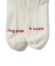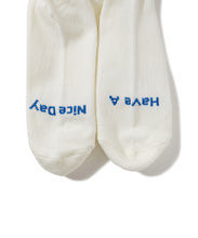 右と左を合わせると一つの言葉が完成するユニークなソックス。左右後ろ部分に「HOME」「RUN」、甲部分に「Have A」「Nice Day」のメッセージが。キラキラとしたラメと鮮やかなカラーのメッセージがポップな印象で、履くとテンションがあがる一足です。ユニセックスでお使いいただけます。