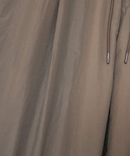 ウエストはゴムとスピンドル(伸縮性のあるひも)を使用したイージー仕様となっており、穴部分とひも先には高級感のあるブラックニッケルを使用。両脇とバック部分には、デザインアクセントにもなる閂止め(かんぬきどめ)を施すなど、細部までこだわった一枚に仕上げました。