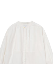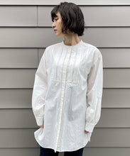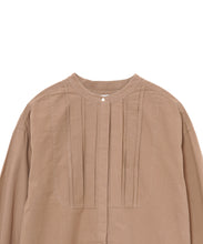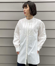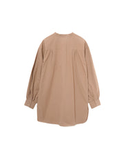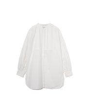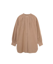 ヨーク切り替えに太めのタックを施したデザインがポイントのバンドカラーチュニックシャツ。 フロントのタックが目をひくデザインで、バンドカラーがクラシカルな印象も与えてくれます。 ハリのあるしっかりとした素材感で綺麗なシルエットを演出してくれるシャツブラウスです。 チュニック丈のゆったりとしたサイズ感は腰回りをカバーしてくれ、リラックスして着用していただけます。今年はニットベストとのレイヤードスタイルがおすすめです。